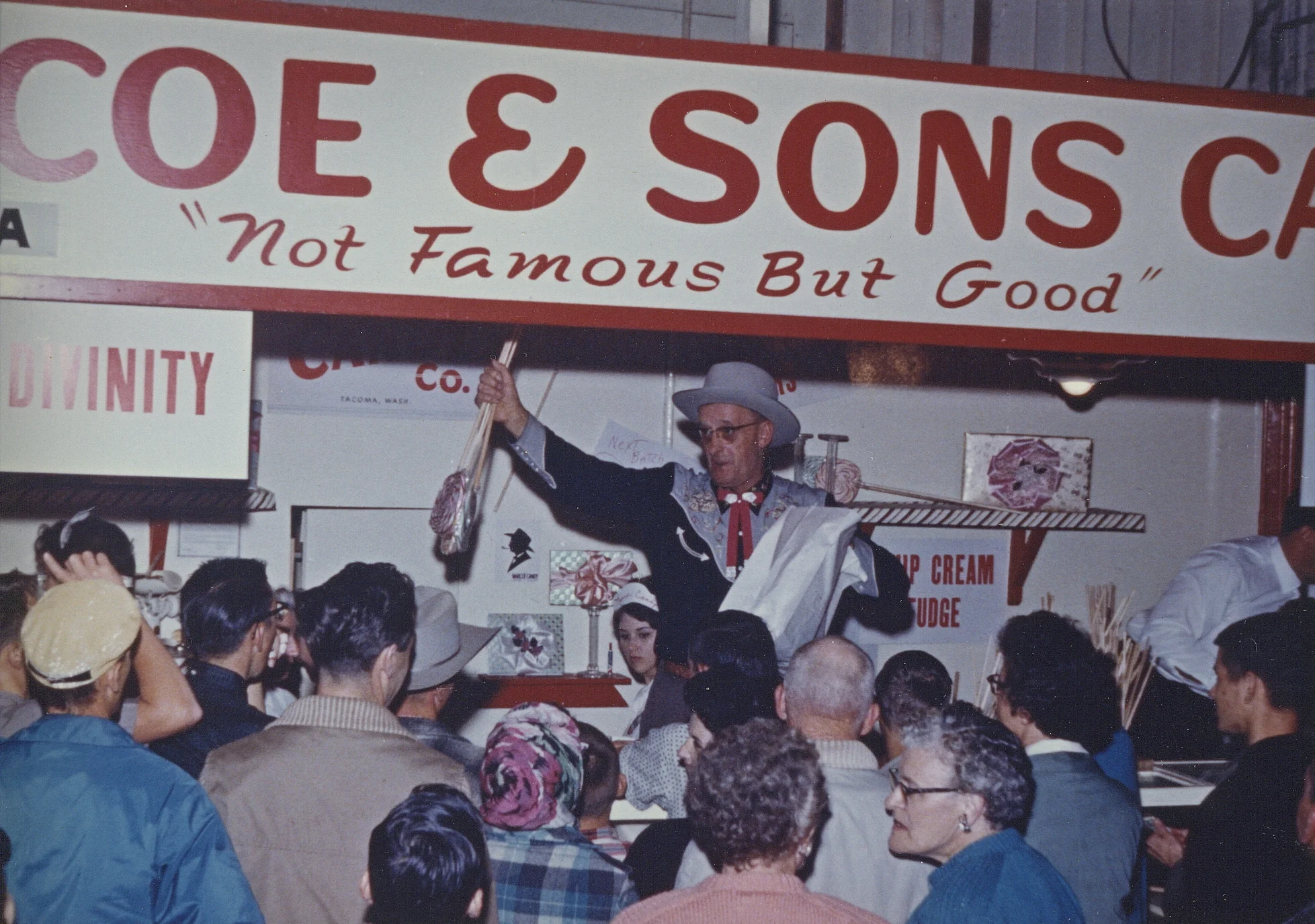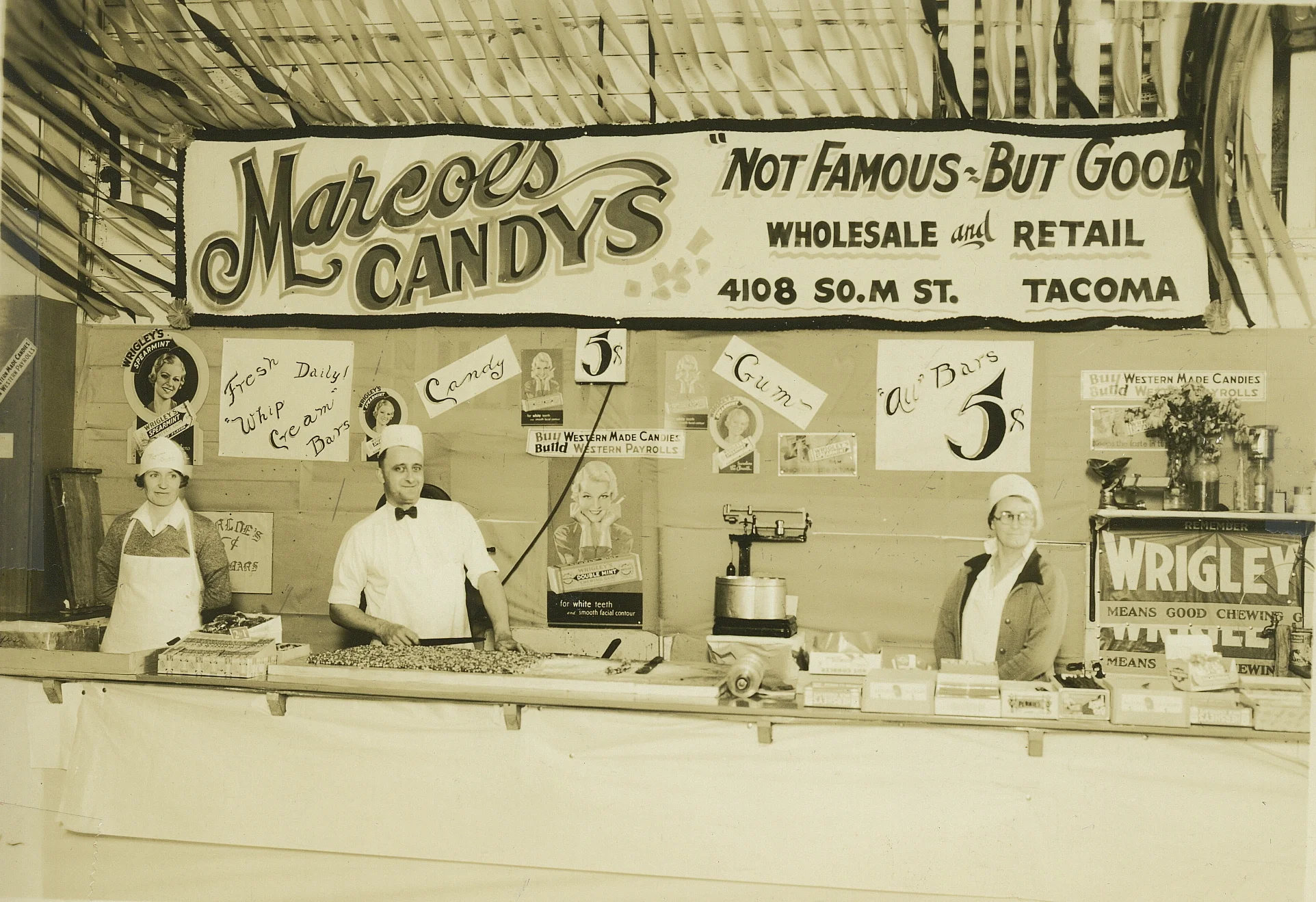 Founders Dora Marcoe (Left) and Floyd Marcoe Sr. (Center) at the original Marcoe's Candy stand at the Washington State Fair circa 1930. The original company slogan was "Not Famous - But Good"